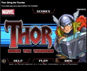 To commemorate the opening of “Thor” nationwide tomorrow, Marvel has created a little 8-bit gaming action called Thor: Bring The Thunder.  It’s an attractive game, with lots of bright colors and sharply-defined backgrounds.  The characters are small and somewhat squat, visually resembling Kubrick or Lego figures.  I am surprised that it hasn’t been offered as an iOS or Android app, though I haven’t looked to confirm.