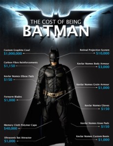 For instance, if you were to purchase a real Batsuit–composed of Kevlar and Nomex instead of rubber–Moneysupermarket.com estimates that it would cost a bit over a million dollars.