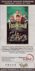 There’s a sneak preview being offered by Washington Post Live of Focus Features “ParaNorman” (and with a title like that, how could you not be interested?) for Wednesday, August 15.