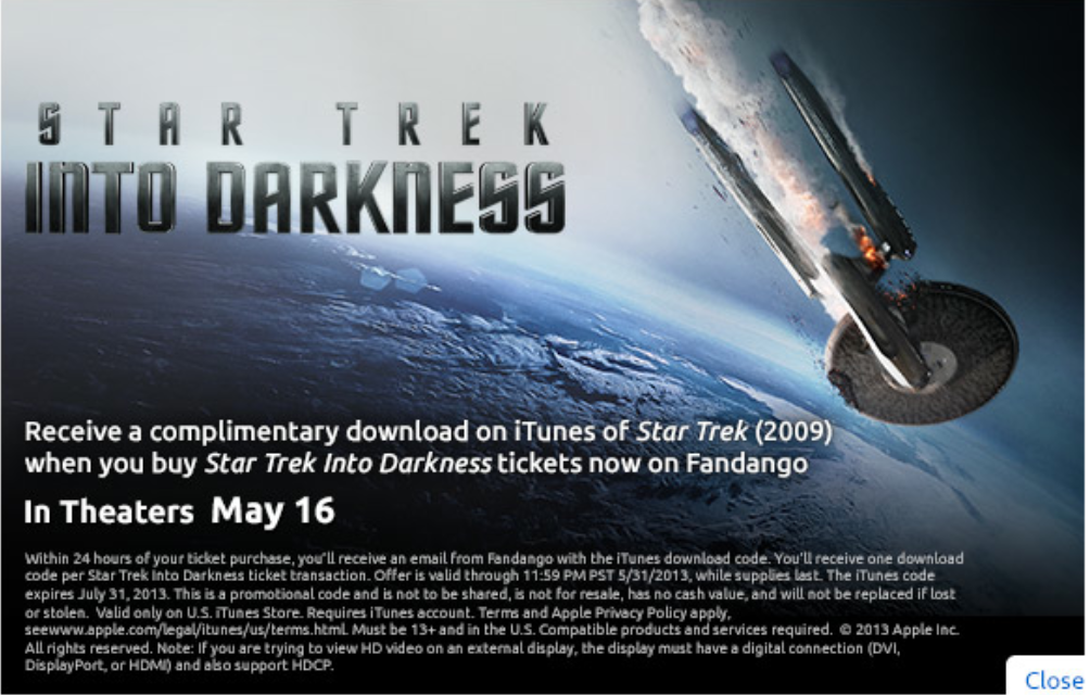 And the best thing is that it’s perfect legal. If you’ve been waiting till Memorial Day to see “Star Trek: Into Darkness,” you’re in luck. Purchase your tickets through Fandango, and wait till you receive an email from them for a code to download the reboot that started it all: 2009’s “Star Trek,” via iTunes.