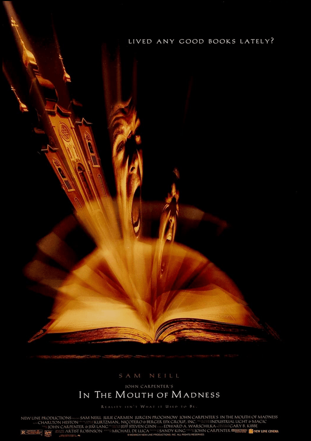 It revolves around an insurance investigator, John Trent (Sam Neill), who’s hired to find a missing author, Sutter Cane (Jürgen Prochnow, who combines the prolificness of Steven King with the Cthulhu mythos of H.P. Lovecraft, essentially).